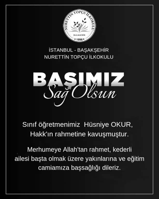 Okulumuz sınıf öğretmenlerinden Hüsniye OKUR vefat etmiştir. Allahtan rahmet diliyoruz.